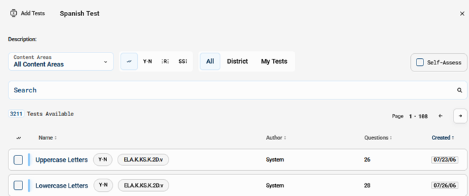 - Use the filtering tools at the top to locate the test you want to add, then select the test(s) by checking the checkbox (Image 2).