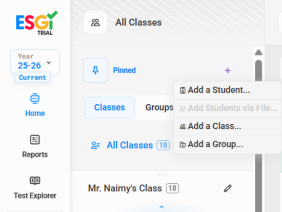 1. Log into your ESGI Teacher Account and click on the + button located at the top of the All Classes Dropdown located on the left of the screen (see Image 1), then click Add a Student.