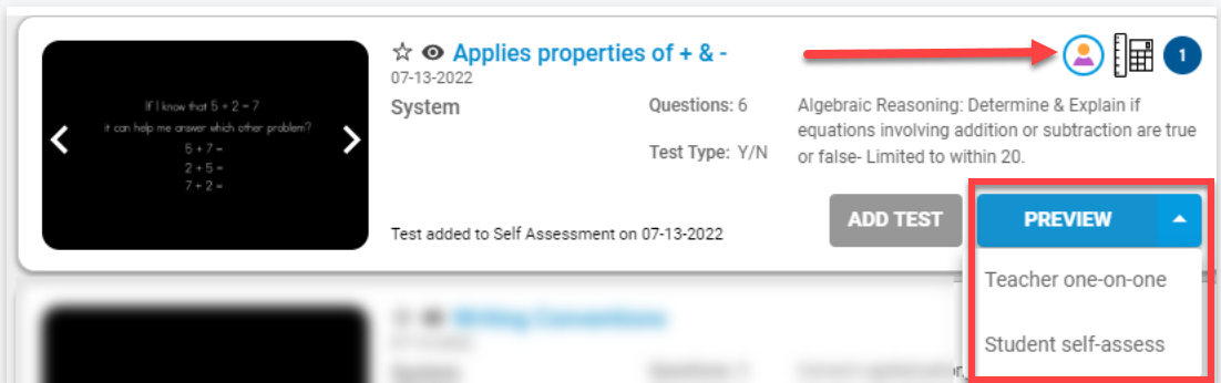Self Assess tests are identified with a student in a circle icon and can be previewed first