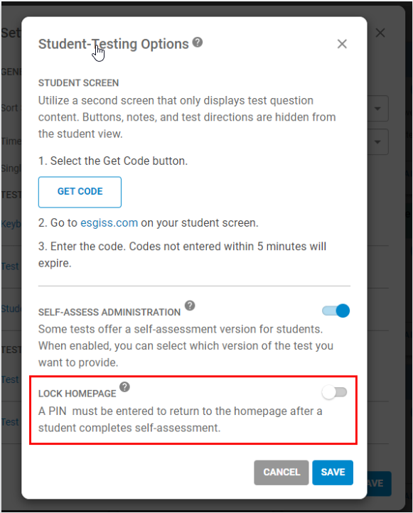 1. Go to your Account Setting, select Student Testing Options and slide the bar to the right next to Lock Homepage: