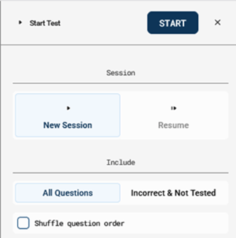 Please Note: If you close a previous test session before all questions have been marked as correct, incorrect, or skipped (by selecting the “X” in the top right corner), you will have the option to resume the test later. If you choose to resume, you will continue from where you left off. Upon completing the test, the results will be recorded as a single test session with the most recent test date.