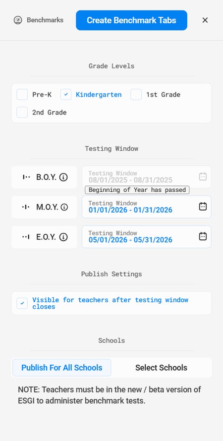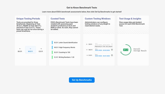 District Admin accounts have a section called Benchmarks, which allows admins to publish benchmark tests to schools in their district. These tests cover ELA and Math for grade levels: Pre-K, Kindergarten, Grade One and Grade Two. A key difference between benchmark tests and regular ESGI tests is that benchmark tests can only be administered once, during a custom testing window, from within each of three preset timeframes: Beginning of Year (B.O.Y.), Middle of Year (M.O.Y.), and End of Year (E.O.Y.).