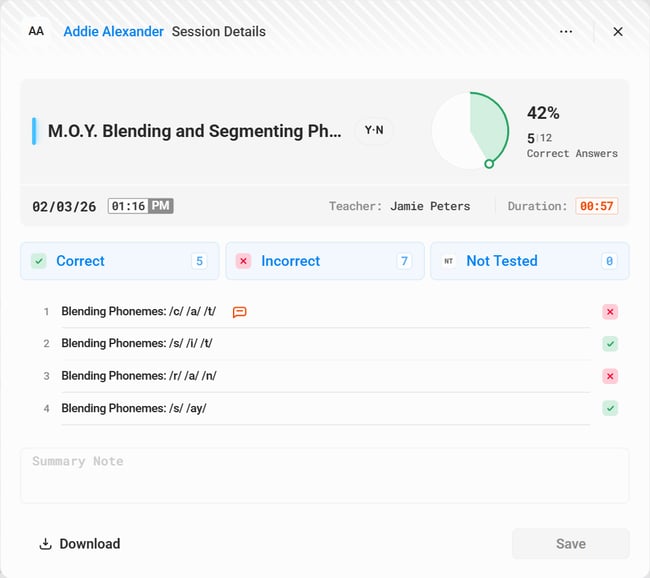 • Additionally, if a student has been tested, you can click on the Magnifying Glass Icon located to the right of the test score column in the Students Tab to open the Test Session Details Panel. From the Test Session Details Panel, you have the options to filter by correct, incorrect, or not tested questions; view Test Summary Notes and comments; and download the Test Session (see Image 5).