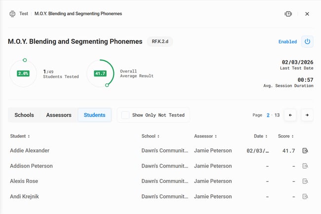 • Students tested column along with the progress bar that will update (click column to sort it from ascending to descending or from descending to ascending)