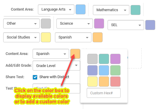 Content Area – Select a content from the drop-down list (Language Arts, Math, Spanish, Science, Social Studies/Humanities, The Arts, Technology or Generic). The test color will be updated based on the content area chosen.