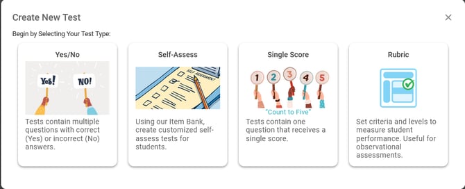 2. Begin by selecting your Test Type: Yes/No, Self-Assess, Single Score, or Rubric (see Image 1):