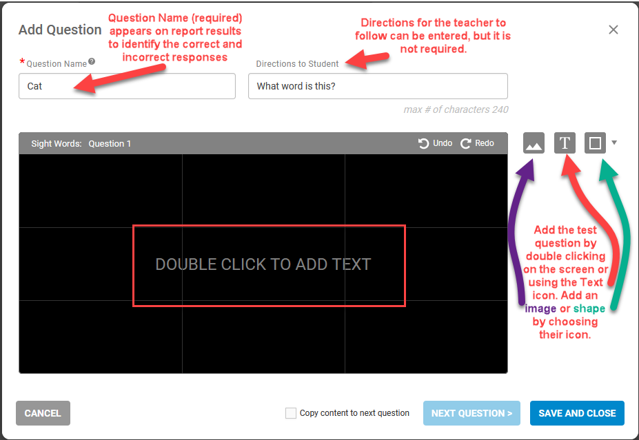 6. Enter the test question information. Click “Save and Close” if there is only one question (Single Score) or “Next Question” if adding another question. A question can be duplicated and the Directions, Question Image, Shape and/or Text will be copied to the next question by checking the "Copy Content to Next Question" box. The checkbox can be deselected at any time.