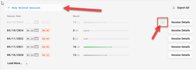 Under Sessions you will see the option "Show Deleted Sessions." To restore a test session, click the "Show Deleted Sessions" box (Image 3).