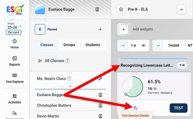 Select the Class List Dropdown to display your class, then select the name of the student whose test session you wish to delete or restore.