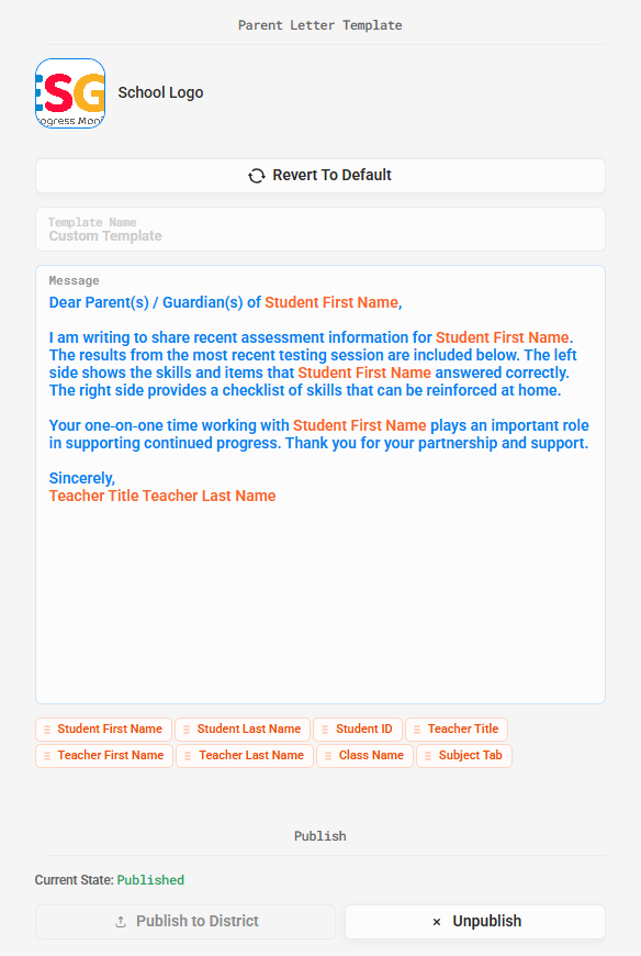 A District Admin can create a universal message for all teachers to use. A logo can also be added.