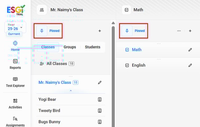 - If you'd prefer not to keep selecting the dropdown menu to access your class list, you have the option to pin your classes, groups, or students. This will allow you to maintain a constant view of your class on the screen. When you're done, simply unpin your selection to return to the full view of test cards.