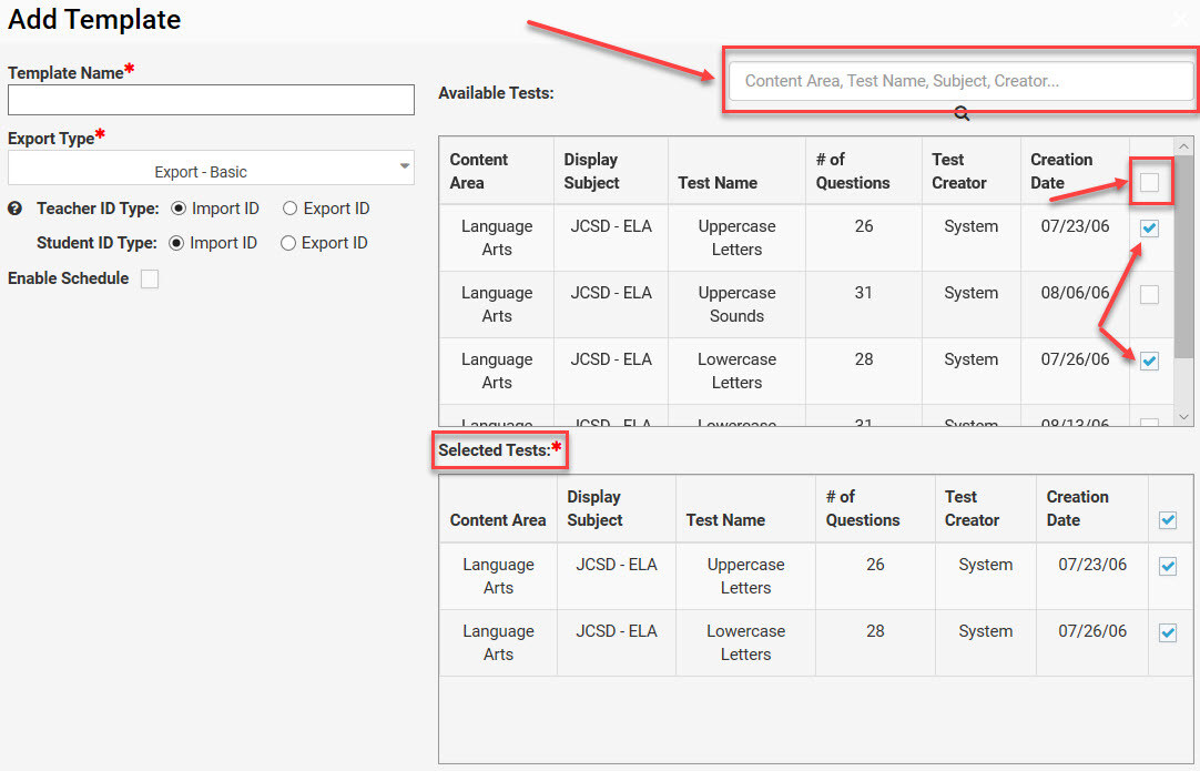 2. Search for the tests to include, then click on each box on the right side of each test to add them individually.
