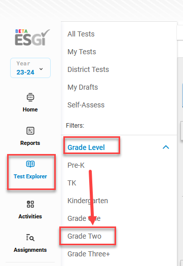 To find the Second-Grade tests, select Test Explorer on the Dashboard. Select the #2 for 2nd-grade tests.