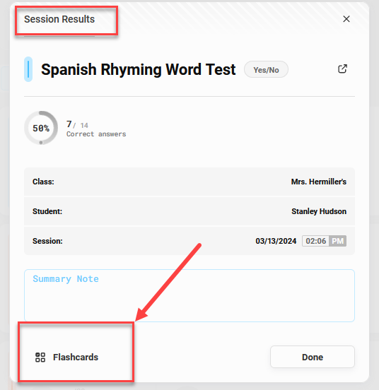 Immediately after you have administered a test with your student, you will get the results screen with the option to print flashcards for that test: