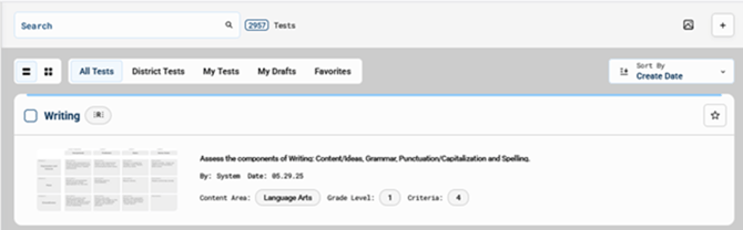 - Sort By: Display tests (ascending or descending) by: Test Name, Create Date (default), Content Area, Standard, Author, # of Questions