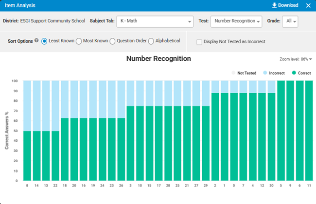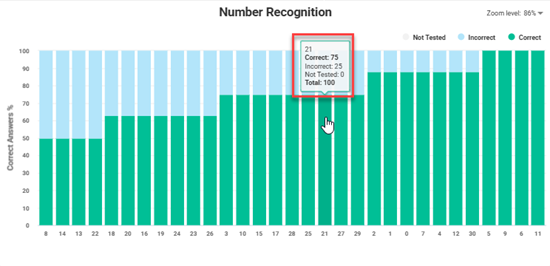 When you hover over any bar, you’ll see the number of correct, incorrect, and not tested responses for that specific question. The graph also shows the total number of students tested (Image 1).