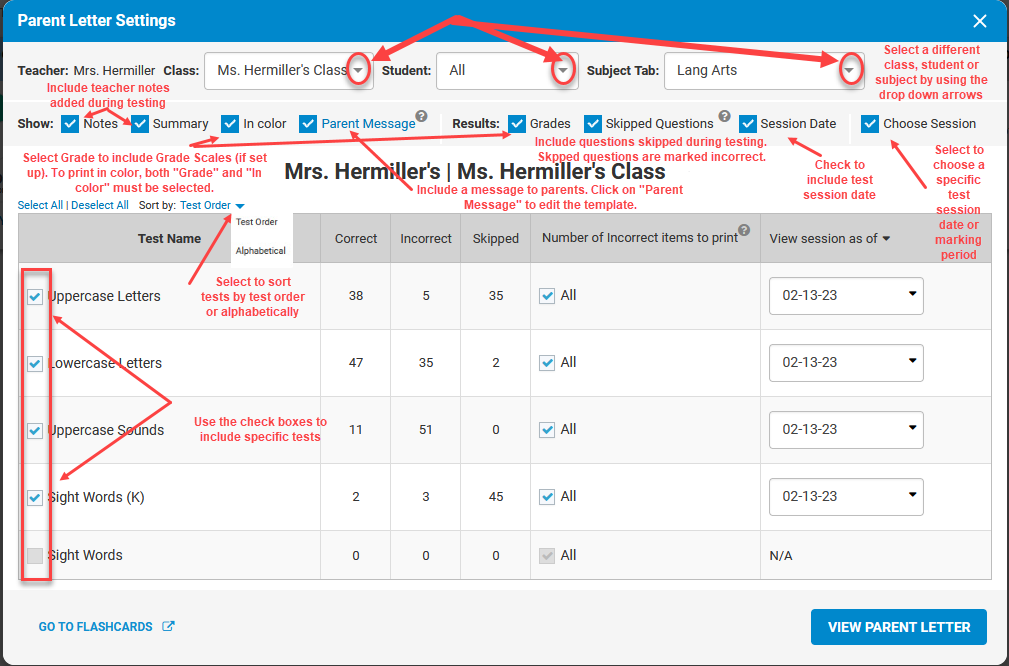 The test session/marking period dates are globally applied to all tests with a checkbox to the left of the test name but can be customized for each test. - Once the desired settings are selected, click “View Parent Letter”: