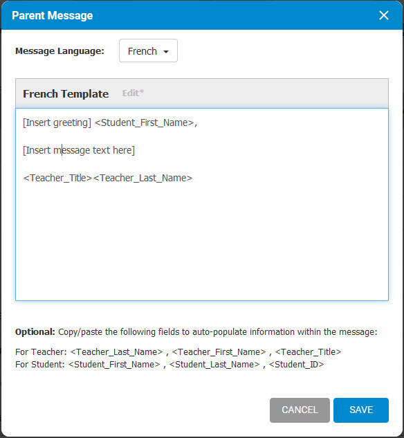 - Select the Language from the drop down, click Edit Message, and then modify the Parent Letter text in that language.