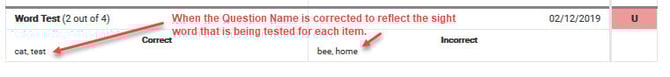 If the Question Name appears as the answer to the question on the Parent Letter under the “Correct” and “Incorrect” headings, then the author used the Test Title for the Question Name of each question when creating the test. This field should be the name of the question and can be edited only by the test author. The Edit/Modify a Test Support Page provides step-by-step instructions.