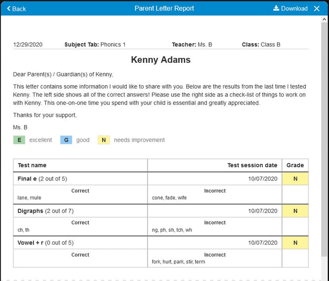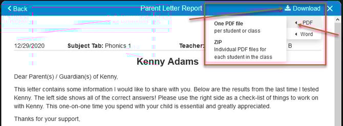10. You can download and print your Parent Letter Report by clicking on the blue Download button located at the top right of the Parent Letter Report preview.