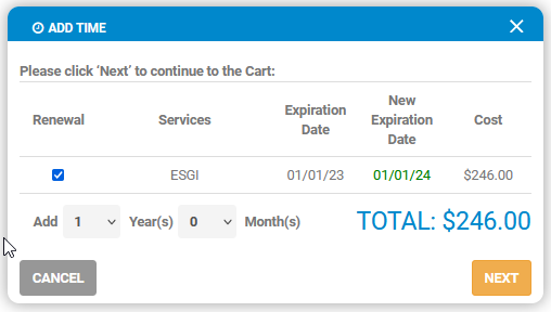 5. On the Add Time screen, the current Expiration Date and New Expiration Date will be shown (new expiration date will default to 12 months after current expiration date). Additional months can be added by selecting the drop-down button and the months will be prorated. Click the "Next" button.