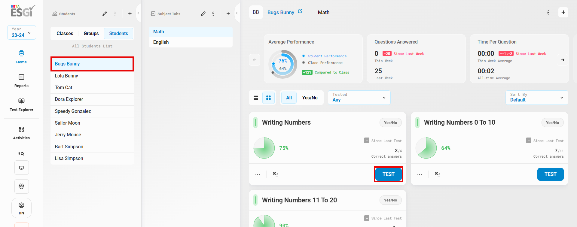 3. Click on the arrow icon located to the right of the student who you'd like to test.