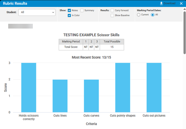 When selected, the report will display the Baseline Score, which is the rubric score the student received the first time they were tested on that rubric, regardless of the test date or marking period.The baseline provides a reference point for measuring growth. Comparing a student’s current score to their baseline can help you determine whether interventions, instruction, or supports are having the desired impact over time.