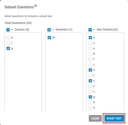 3. Select any questions (Correct, Incorrect, and Not Tested) to run as a shorter test.
