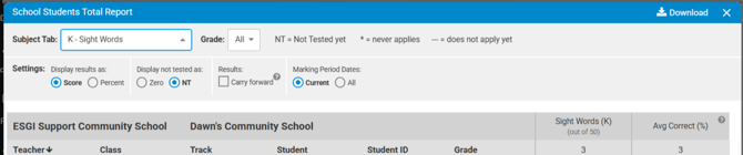- If the NT radio button is selected, an "NT" will display if the student was not tested.