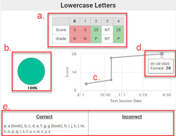 d. Hovering over a data point on the line graph shows the date the test was administered and the number correct for that specific test session.