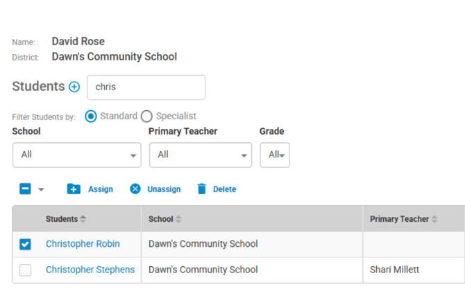 2. Using the Search by student or ID field, enter the name of the student you wish to assign. If the student is in Student Manager, the student's name will display as it is typed. You can also choose to filter students by their school, teacher, and/or grade, as well as by if they are a standard student, or if they belong to a specialist (see Image 1).