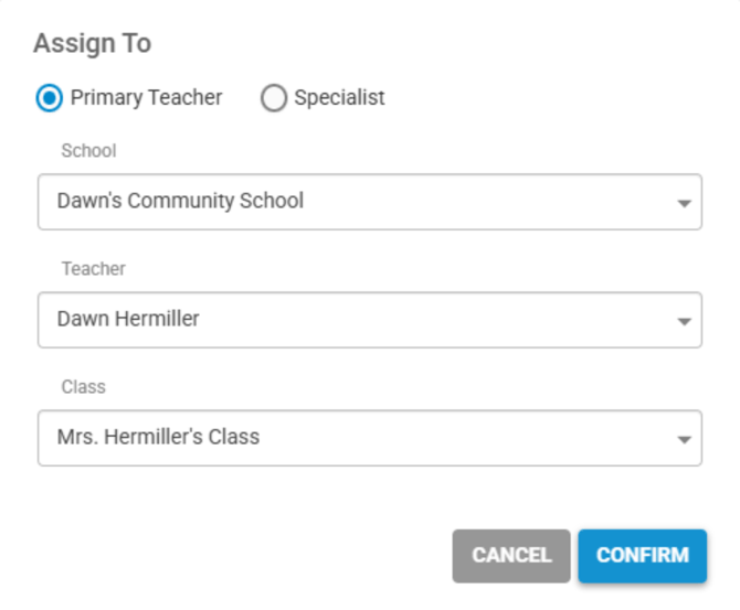 5. Click on Assign, then select whether to assign the student to a Primary Teacher and class or Specialist and group. You will also need to select the school location if you are using a district admin account (see Image 2).