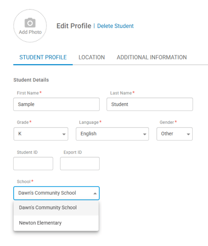 3. Click on LOCATION to the right of STUDENT PROFILE to place the student in a teacher’s class.