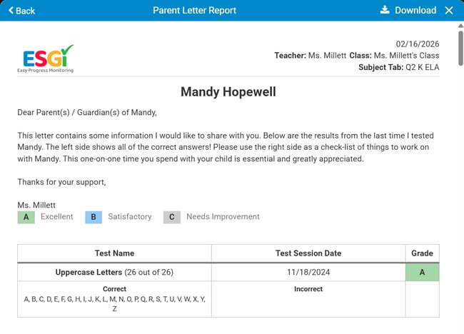 The Parent Letter is a personalized letter from the teacher to inform each student’s parents of their known and unknown skills. It includes each student's test results (correct items, incorrect items, and the grade, if Grade Scales were set up). To avoid students memorizing the items in test order, correct and incorrect items will be shown in alphabetical order. If an item was not tested, it will be optional to include it on the Parent Letter. Question and Summary Notes (teacher observations during testing) can also be included.