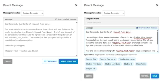 - Parent Template - Allows you to include a message to the parents on the letter. Click on Parent Message to edit the template.