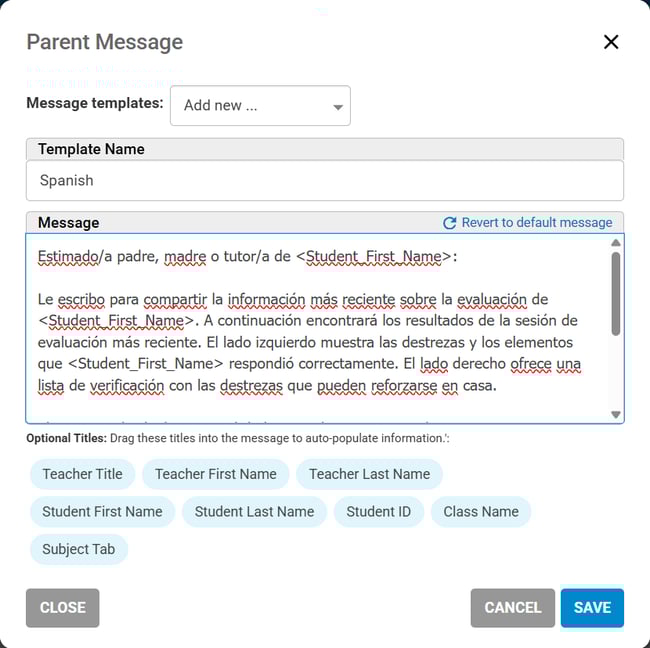 The Parent Letter can be printed in English or Spanish and saved as a Word.doc or PDF. The Spanish translation is available as a template, but the Parent Letter can be written by the teacher in any language and then saved as a template. It can also be printed in color. All tests from a particular tab can be included, and there is also the option to omit certain tests from the Parent Letter. The test session date will be included by default, but an option is available to not include it on the Parent Letter.