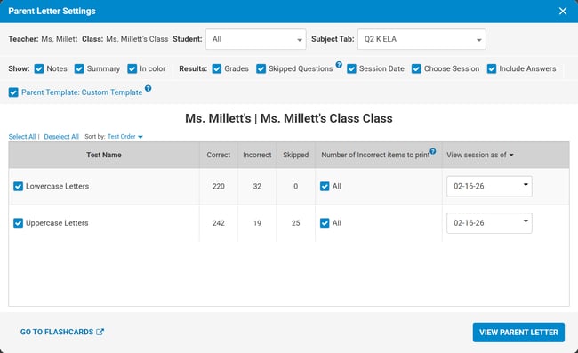 Note: You can only print the Parent Letter in color if you have toggled Grades and In color. - Results - Allows you to include grades, skipped questions, session date, and include answers on the Parent Letter. Additionally, you can toggle to choose which test session will be displayed.