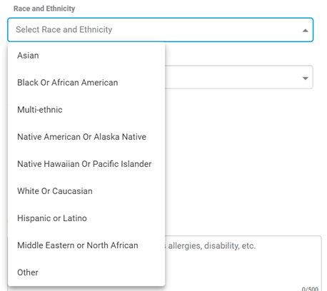 - Race/Ethnicity: Asian, Black or African American, Multi-ethnic, Native American or Alaskan Native, Native Hawaiian or Pacific Islander, White or Caucasian, Hispanic or Latino, Middle Eastern or Northern African