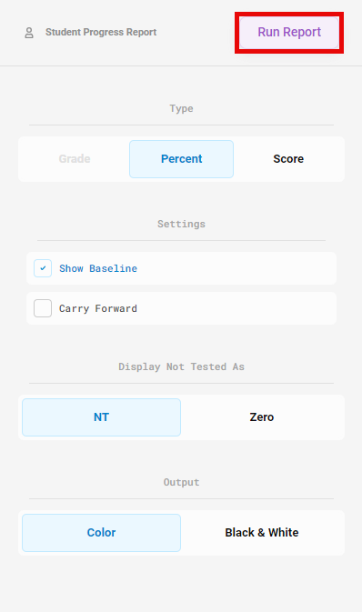 The Student Progress Report is similar to a report card. It lists all the test scores, percentages, and/or grades (if Grade Scales are configured) for one student. The report can be run for all tests on a single Subject Tab, or for all tests on all Subject Tabs.