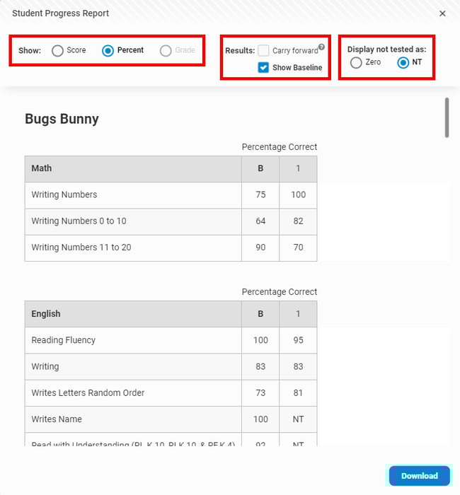 6. To download to PDF, click Download in the bottom right corner (see Image 3), then select One PDF File (a single file that contains all students) or select ZIP (a zipped folder that contains individual PDF files for each student).