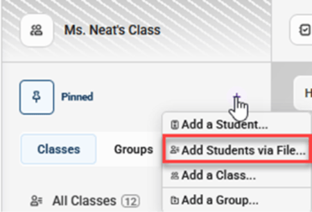 1. From your home screen, click Classes (Classes must be selected to view the drop-down list), select the + button and select Add Students via File (see Image 1).