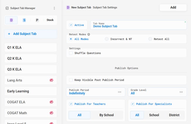 13. After adding and rearranging your tests to your desired order, click the Add button located at the top center of the screen to finalize your Subject Tab (See Image 1).