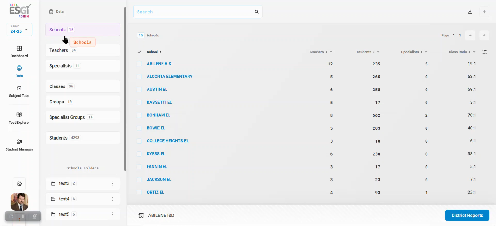 1. From your Admin Dashboard, select “Data” located on the left side of the application window. This will take you to the Data Page, which will always default on the “Schools” tab. (Please note, the “District Reports” button in the bottom right corner of the application window will remain constant throughout all levels of the Data Page hierarchy by default.)